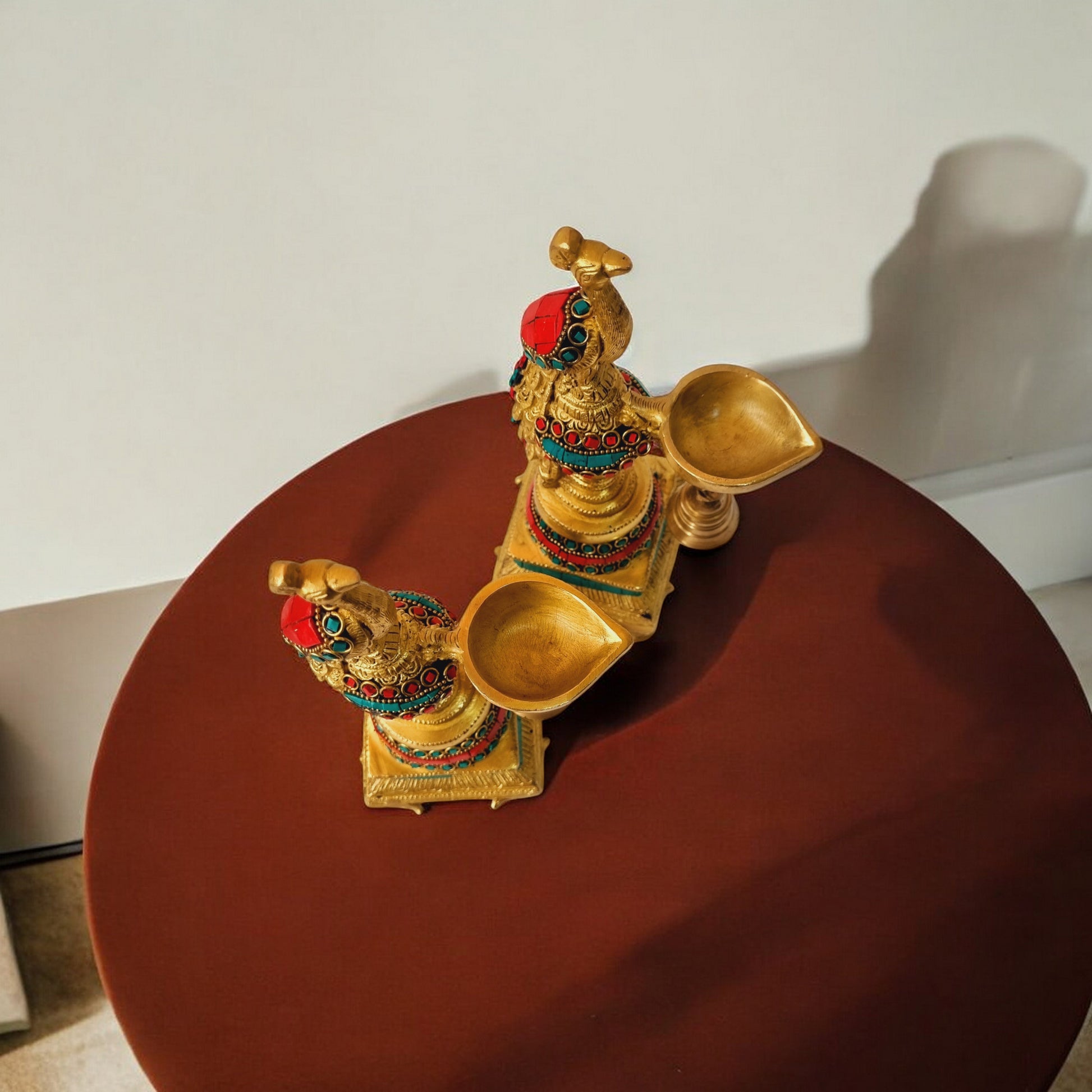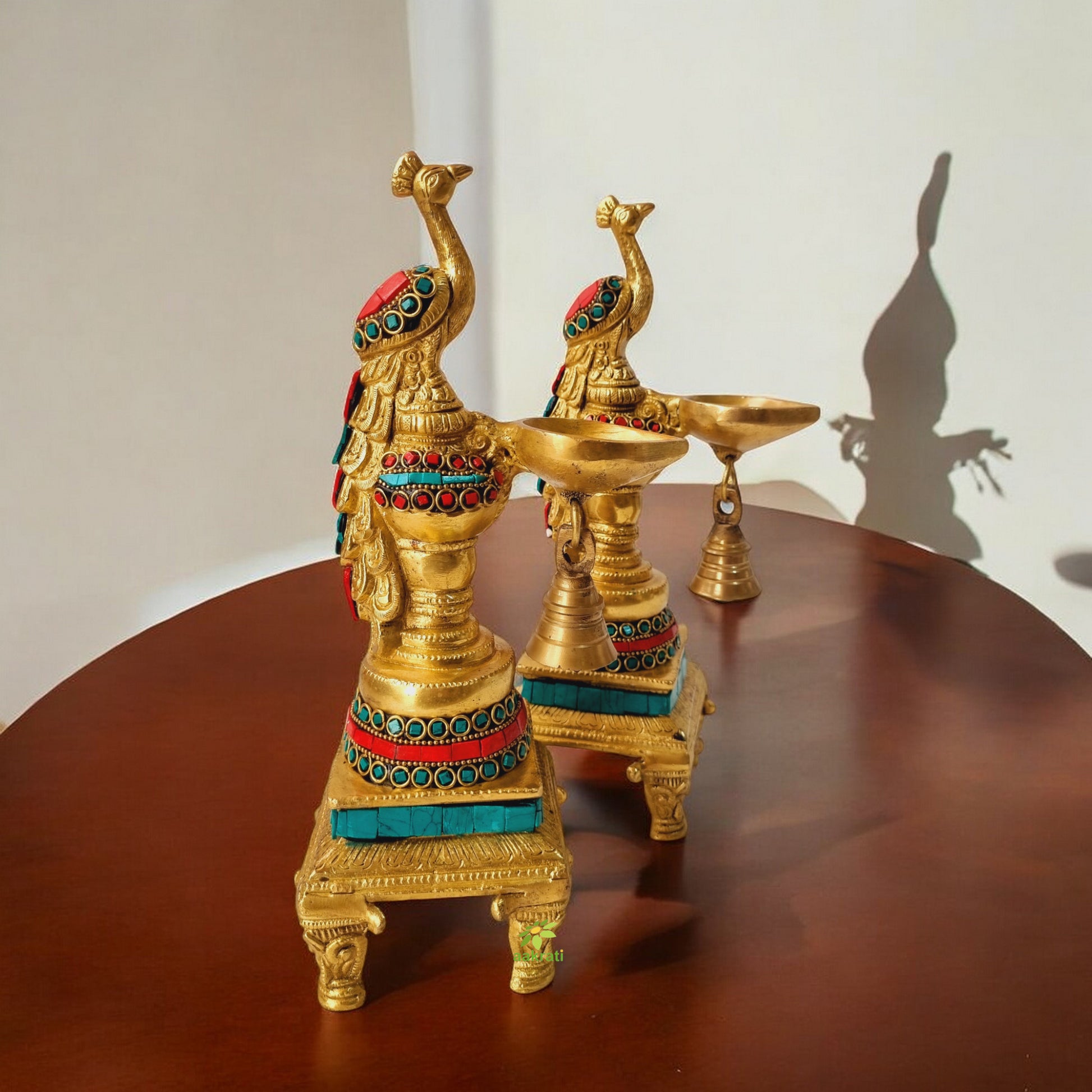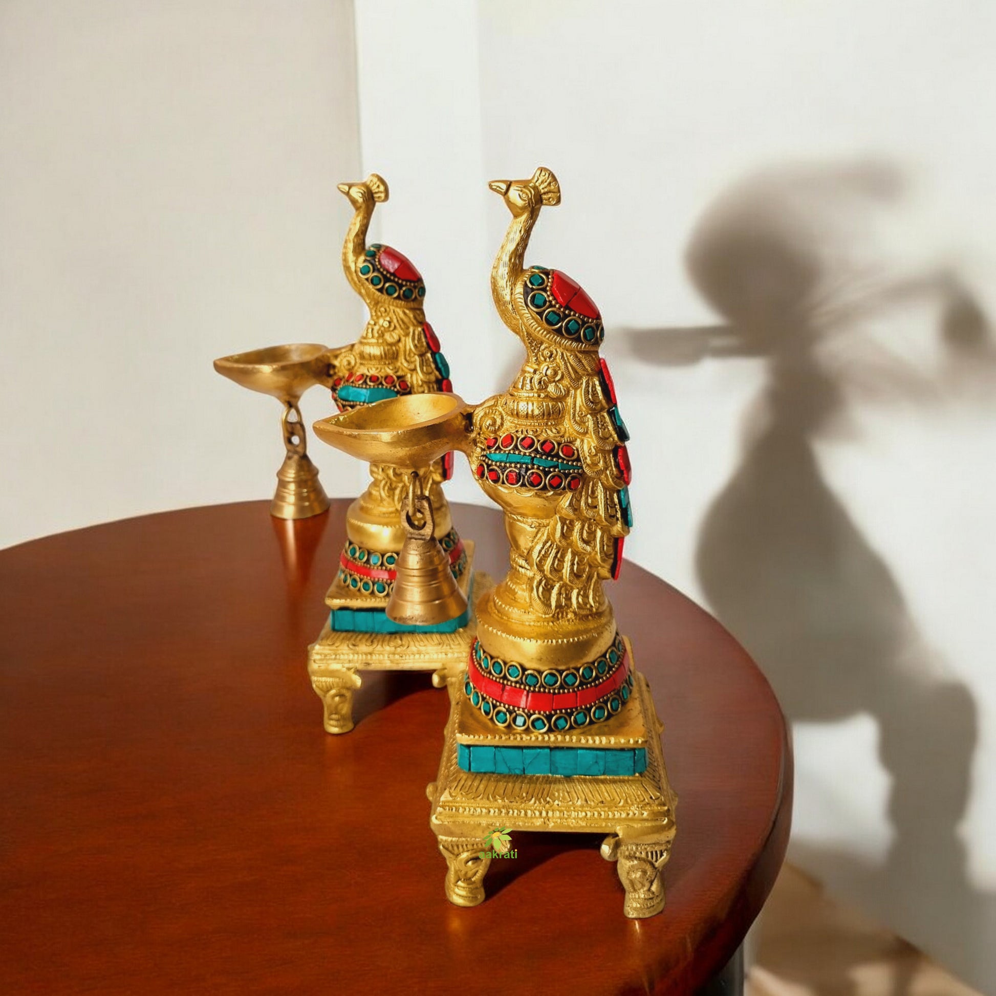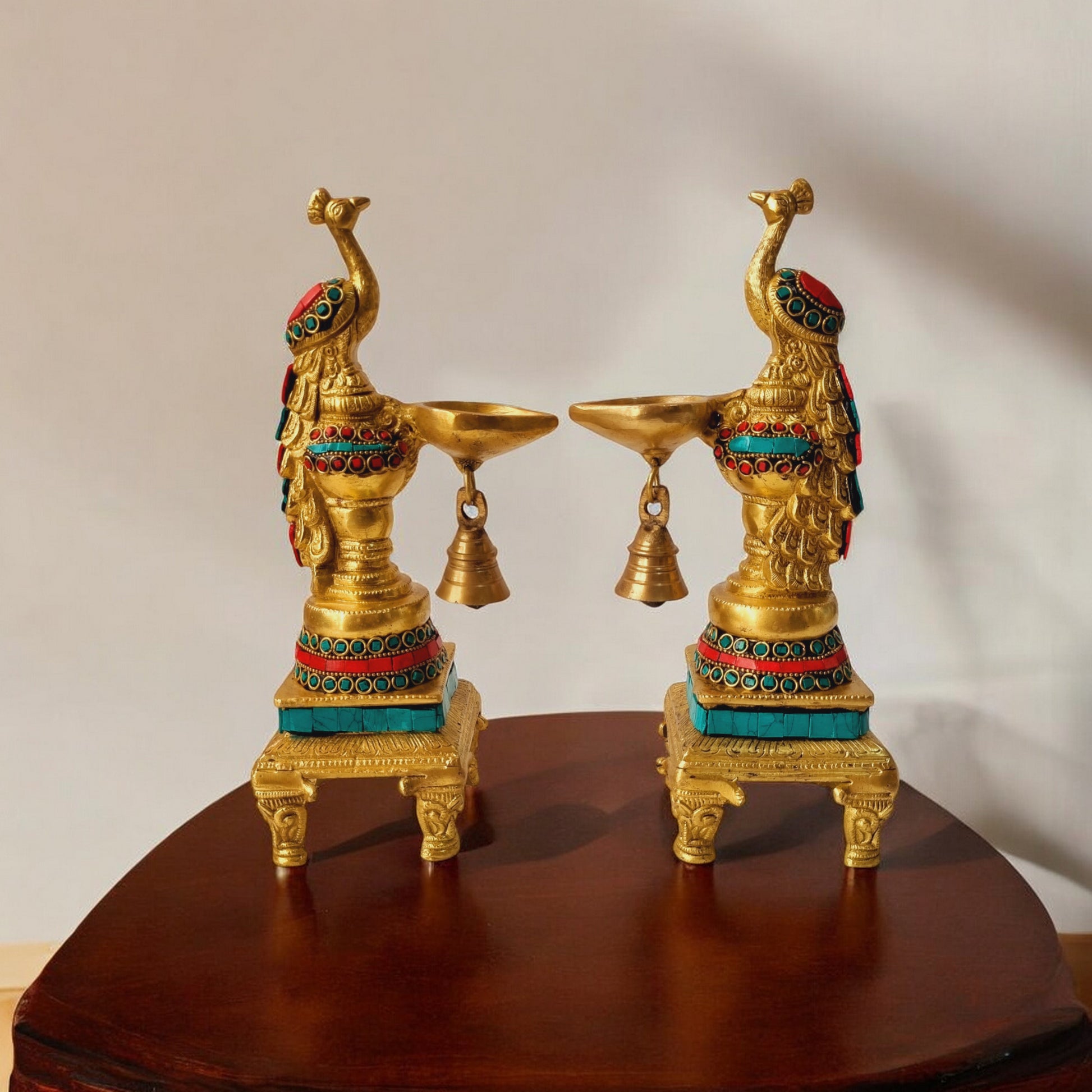 Brass Peacock Diya Set with Stone finish for Home Decoration