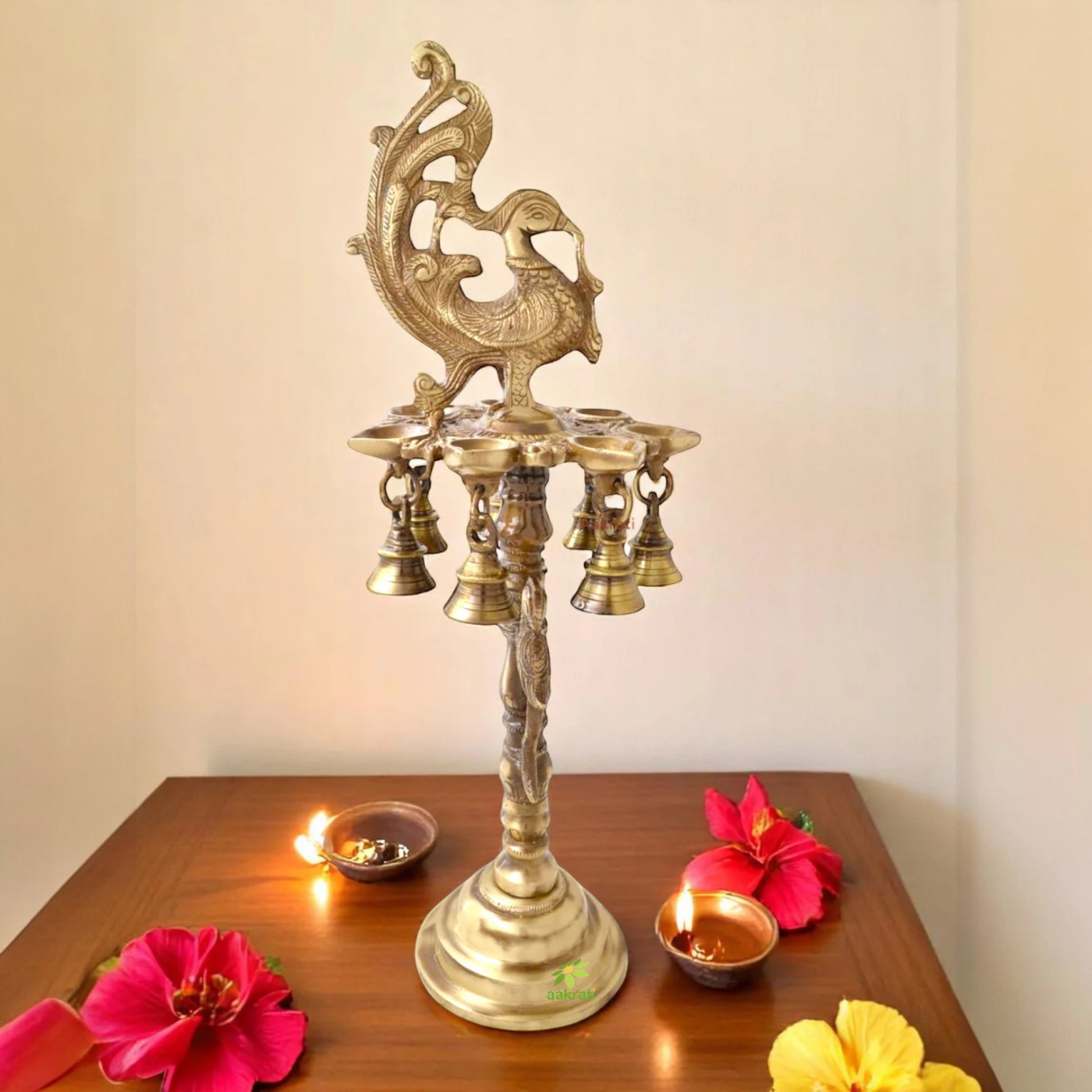 Brass Peacock Diya Stand | Spiritual Diya Stand for Festival Celebrations | Handcrafted Brass Peacock Diya ( Yellow, 17 inch)