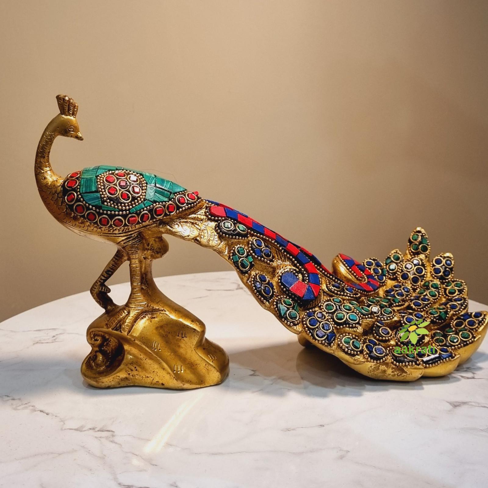 Brass Peacock Showpiece Statue | Brass Showpiece for Luxurious Living | Traditonal Brass Peacock Figurine Made By Aakrati ( Multi Color, 12 inch)