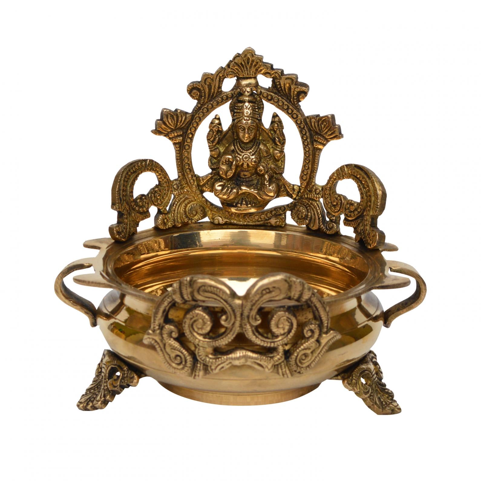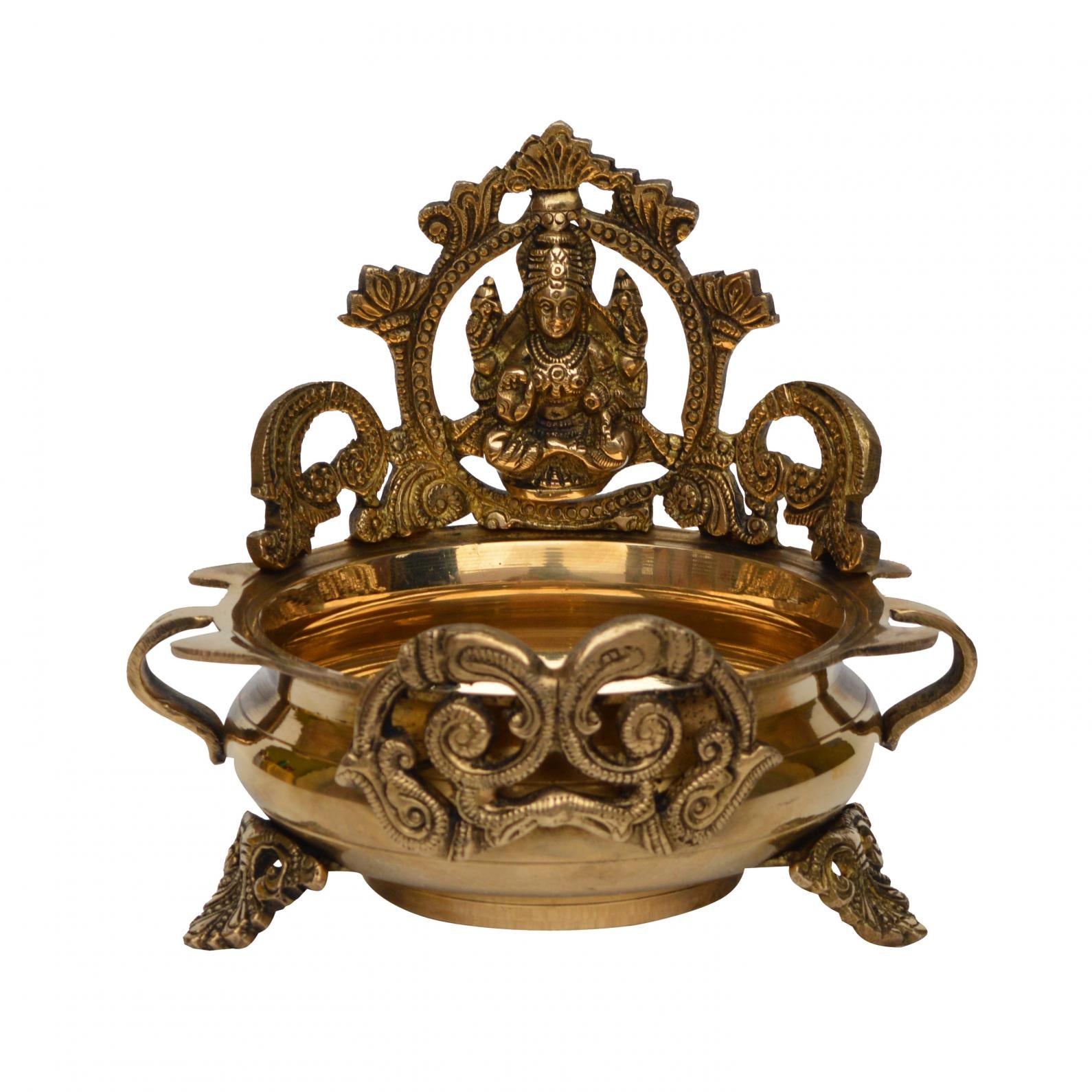 Carved Urli with Lakshmi Ji Statue, 7 Inches Brass Decor Bowl, Urli Decor, Decorative Urli for Corner Tables Ethnic decor