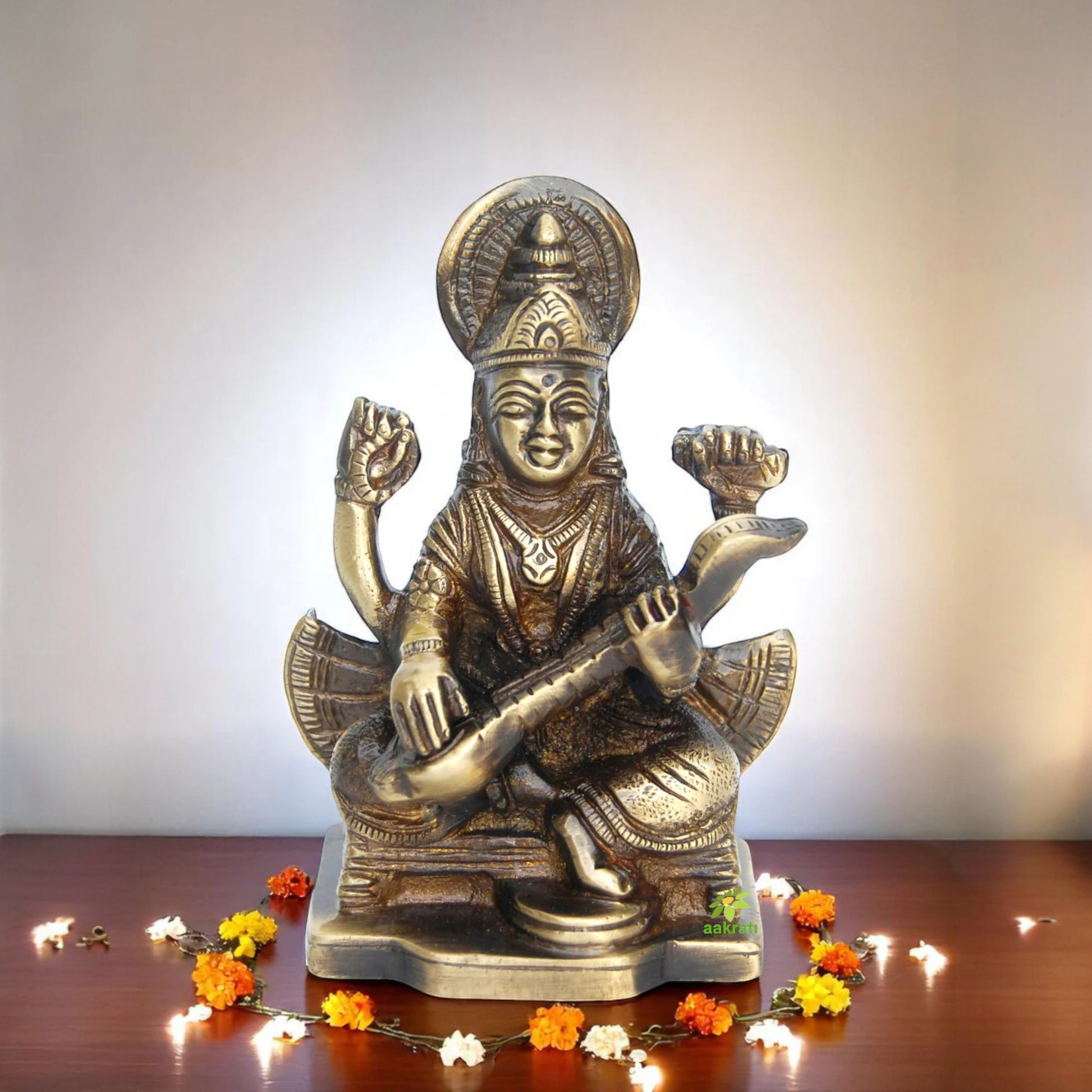Traditional Brass Saraswati Idol | Perfect for Home Puja and Decor | Brass Goddess Saraswati Statue ( Brown, 3.9 inch)