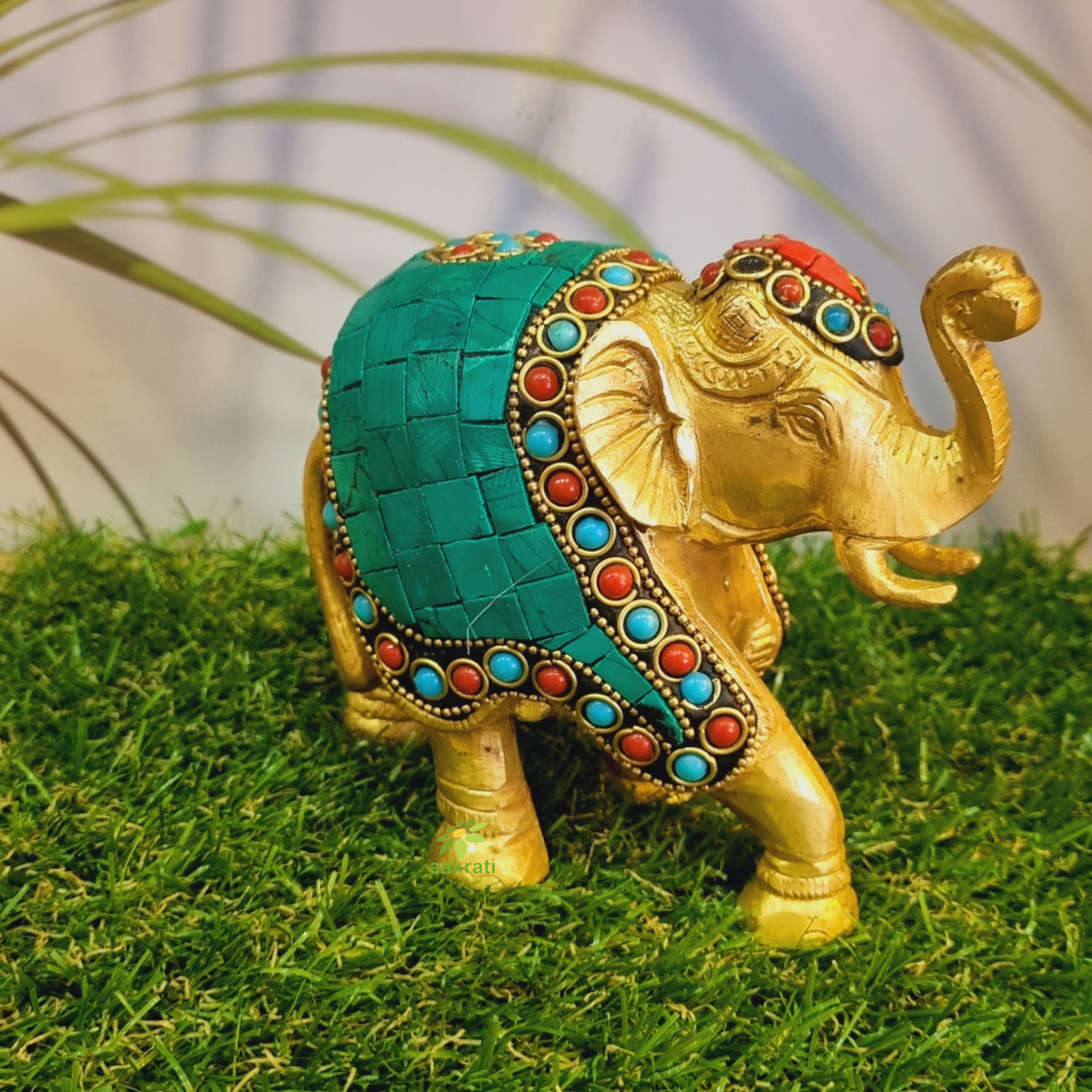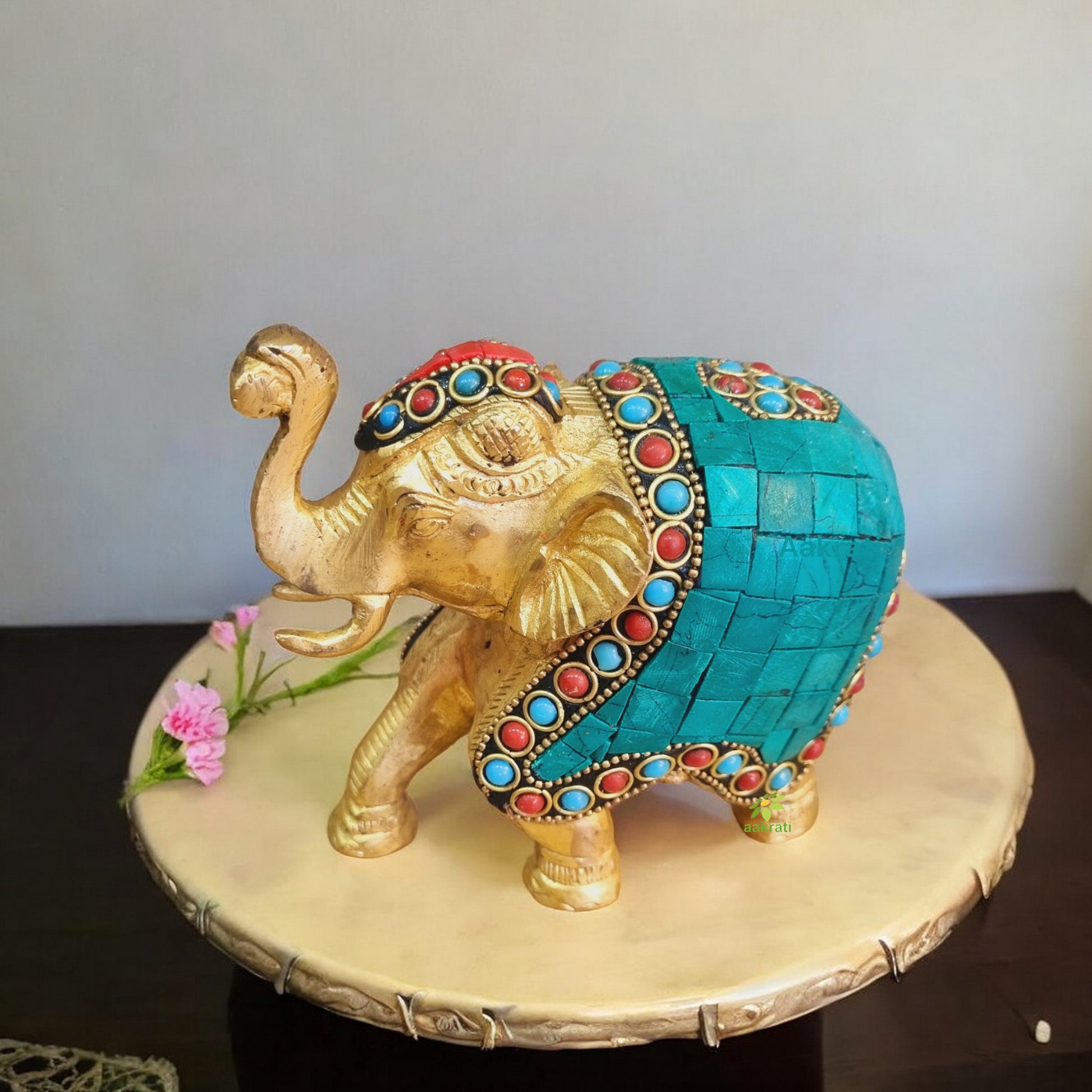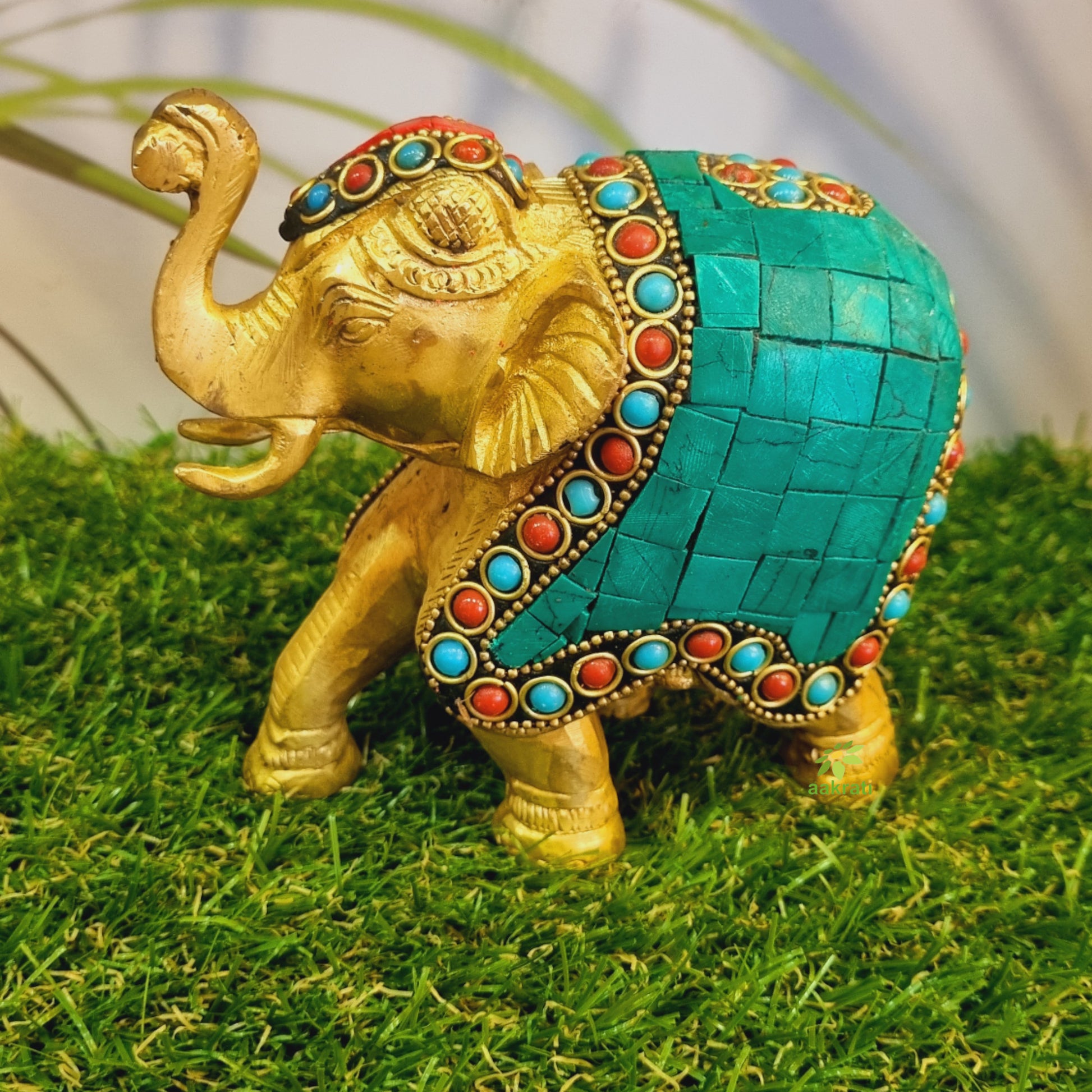 Trunk up Elephant Figurine with Turquoise Gemstones Handwork