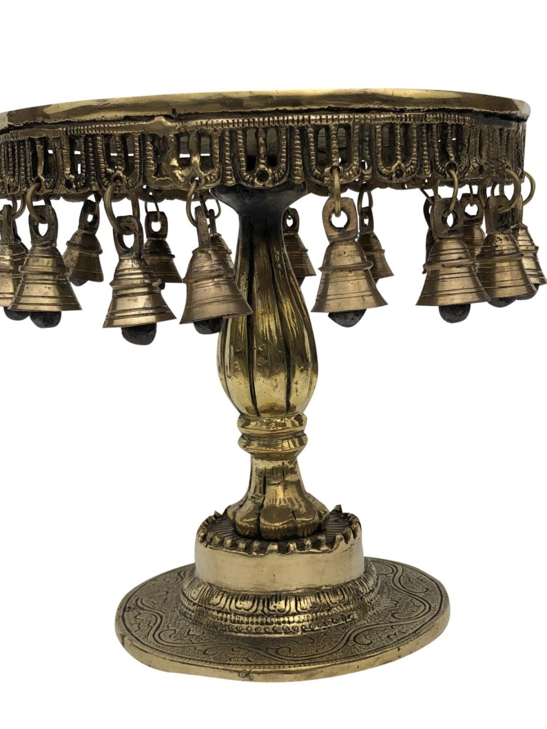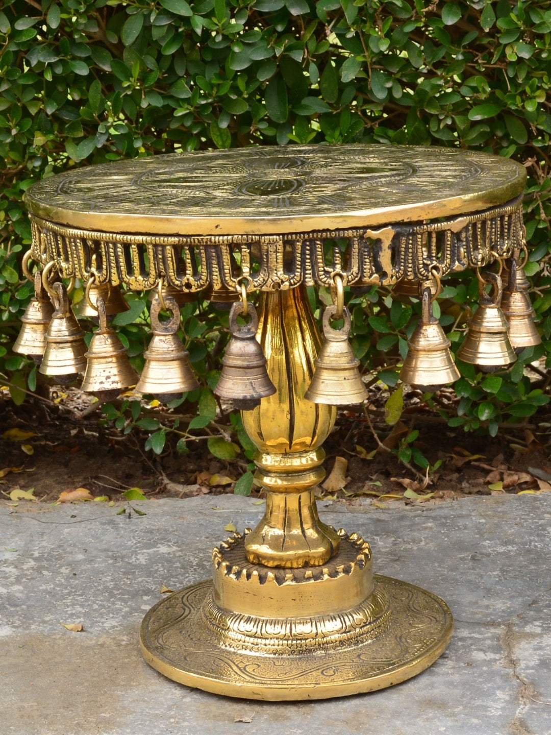 Round Chowki with decorative Pillar and Bells, Brass Pooja Chowki for Home Temple, Chowki For Idols, Pooja - Antique Yellow