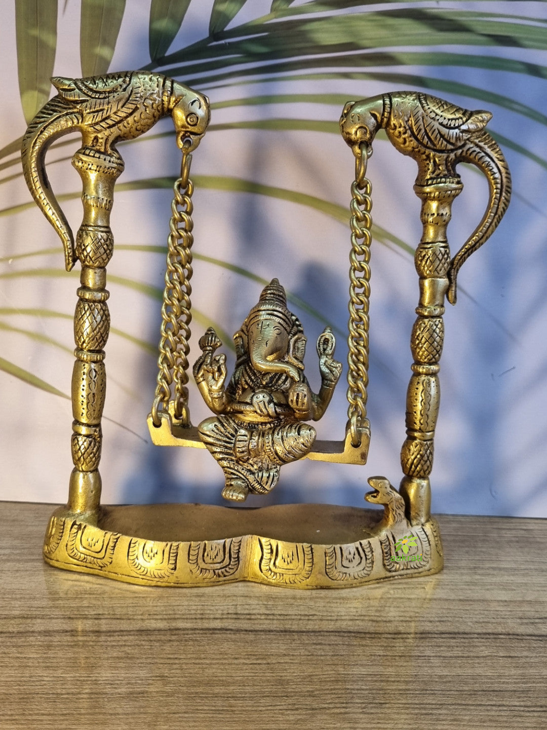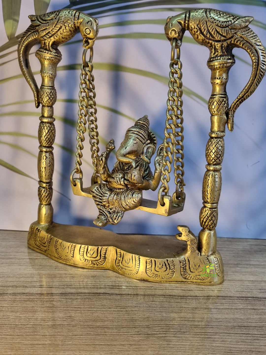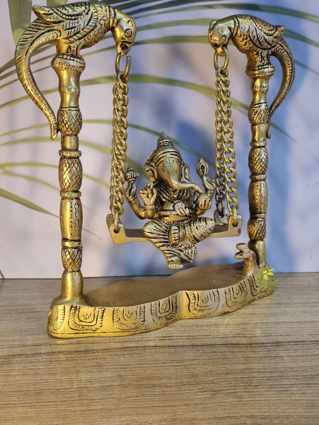 Brass Ganesha Idol on Swing | Perfect Home Decor for Prosperity and Peace | Handmade Decorative Ganesha Murti ( Yellow, 8 inch)