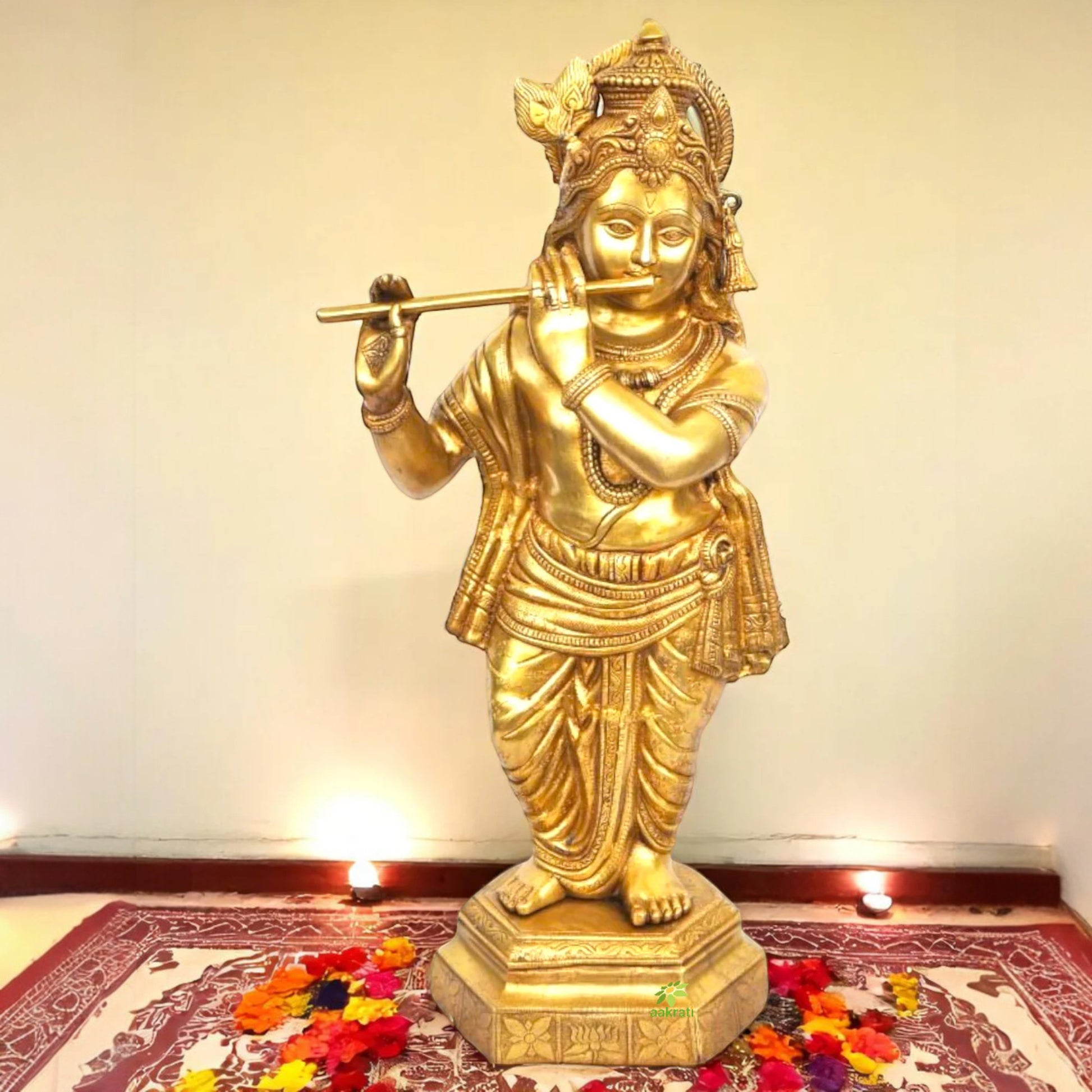 Handmade Brass Krishna Statue | Perfect for Home Temple and Pooja Room | Brass Krishna Murti ( Yellow, 31.5 inch)