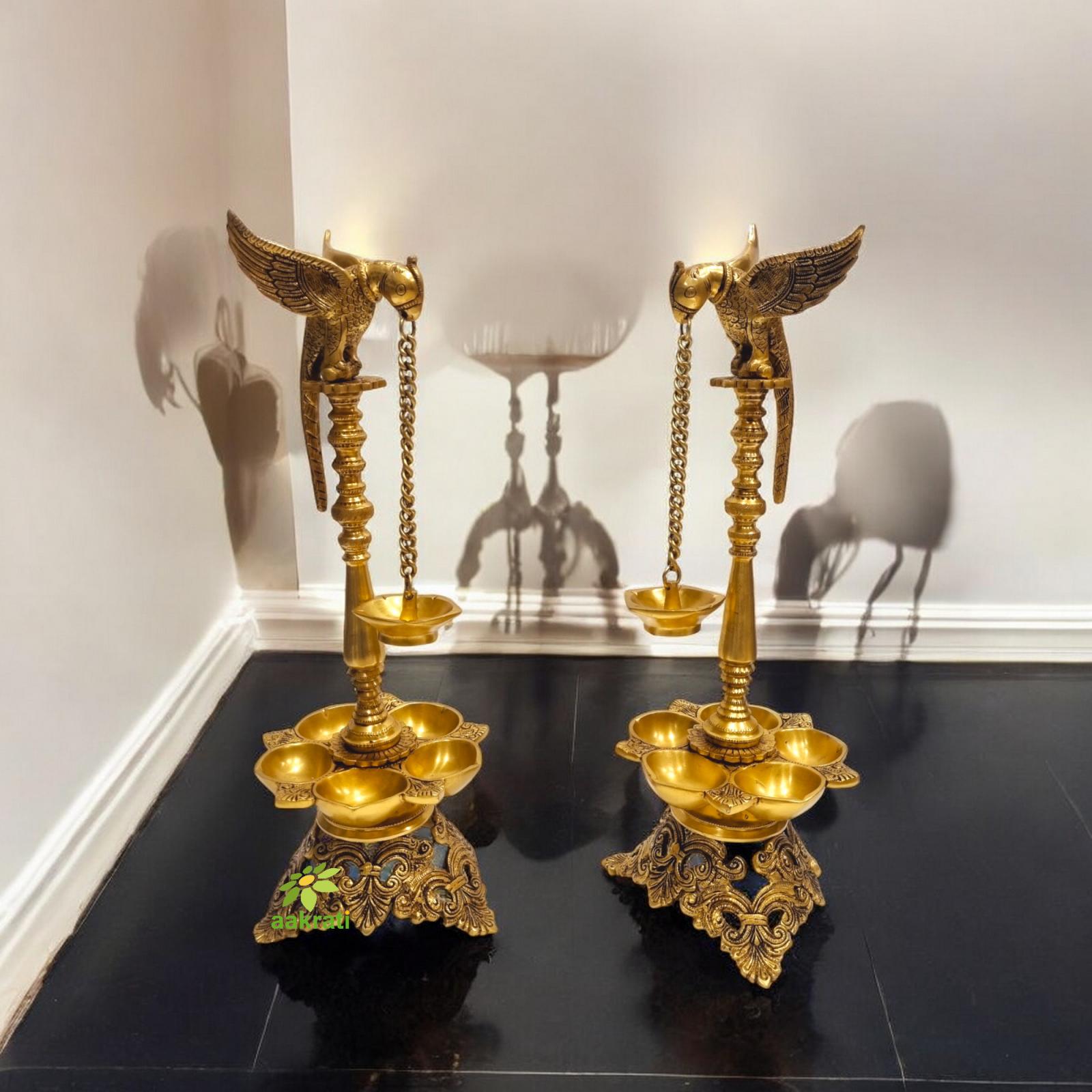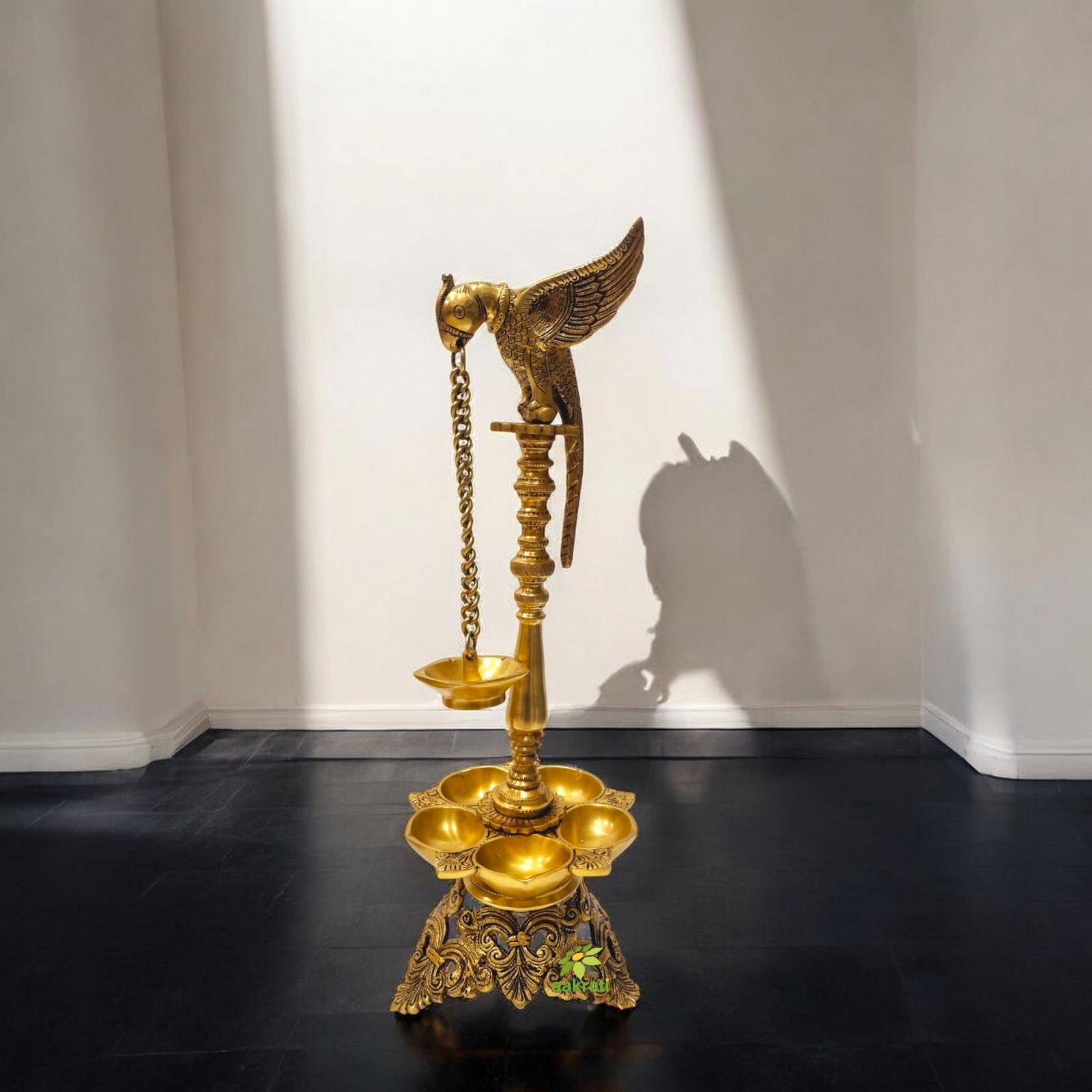 Traditional Brass Parrot Oil Diya Stand | Ideal for Festive Home Decoration | Decorative Brass Oil Lamp Stand ( Yellow, 21 inch)