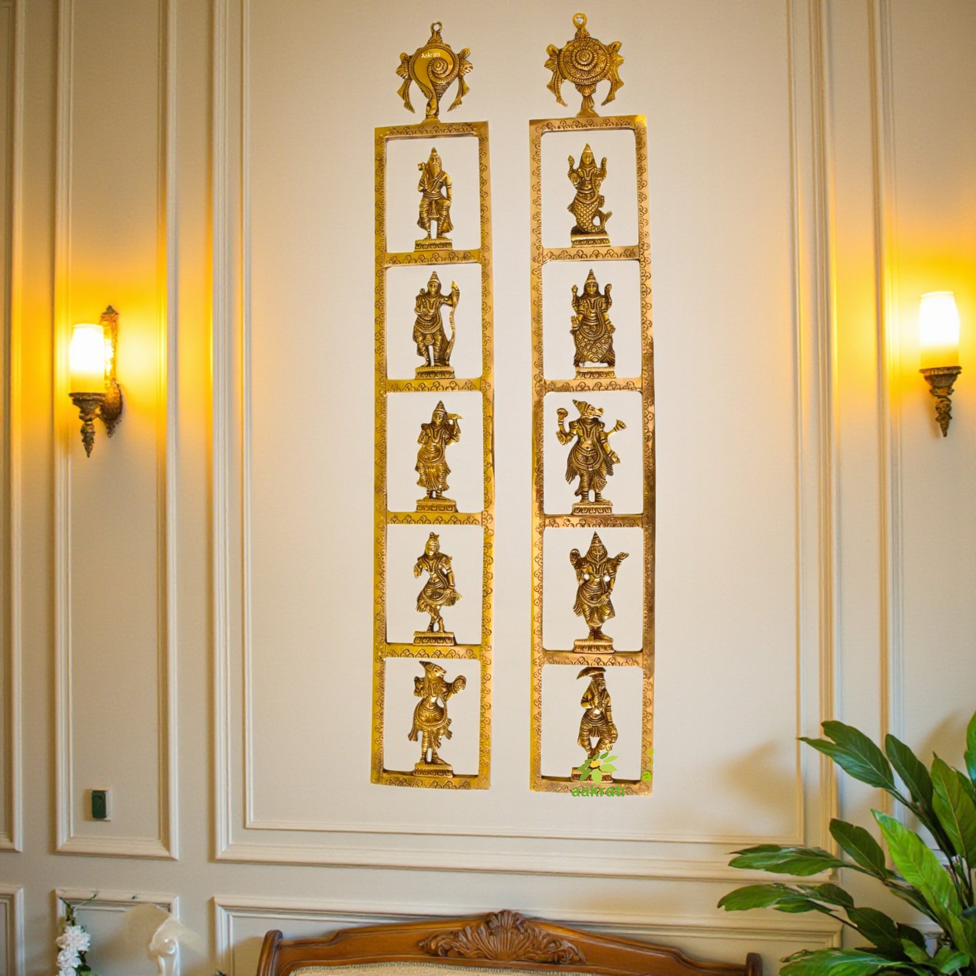 Beautiful brass deities of Dashavatara -Ten Incarnations of Lord Vishnu ( Matsya, Kurma, Varaha, Narasimha, Vamana, Parashurama, Rama, Balarama, Krishna and Kalki.Brass is the most popular metal for cast metal sculptures; a cast bronze sculpture is often called simply a "bronze". It can be used for statues, singly or in groups, reliefs, and small statuettes and figurines, as well as bronze elements to be fitted to other objects such as furniture. It is often gilded to give gilt-bronze or ormolu.Common bronze alloys have the unusual and desirable property of expanding slightly just before they set, thus filling the finest details of a mould. Then, as the bronze cools, it shrinks a little, making it easier to separate from the mould.Their strength and ductility (lack of brittleness) is an advantage when figures in action are to be created, especially when compared to various ceramic or stone materials (such as marble sculpture). These qualities allow the creation of extended figures, as in Jete, or figures that have small cross sections in their support, such as the equestrian statue of Richard the Lionheart.But the value of the bronze for uses other than making statues is disadvantageous to the preservation of sculptures; few large ancient bronzes have survived, as many were melted down to make weapons or ammunition in times of war or to create new sculptures commemorating the victors, while far more stone and ceramic works have come through the centuries, even if only in fragments