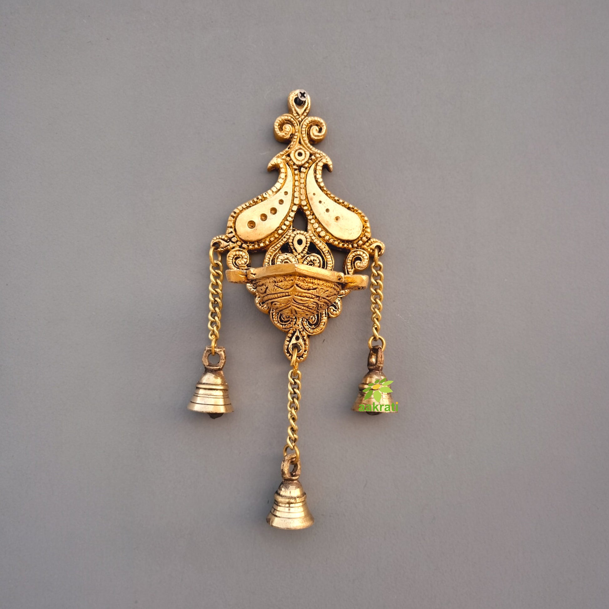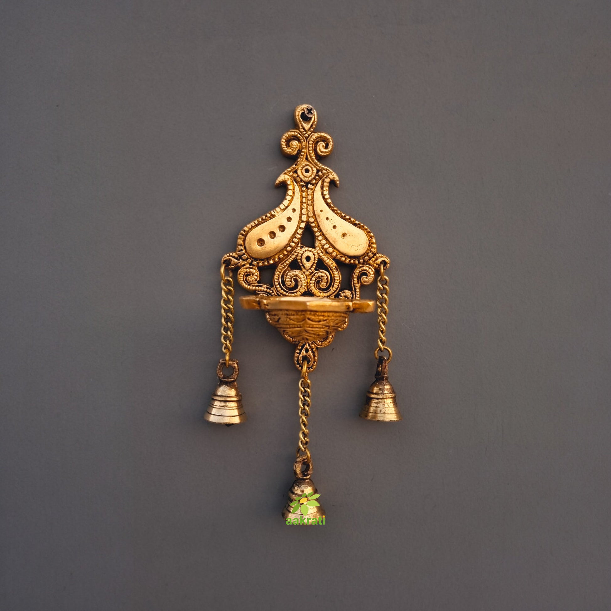 Wall Hanging Brass Diya, Oil lamp, Deepam with Bells in Glossy Black Antique Finished