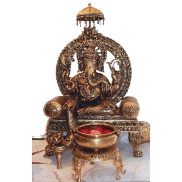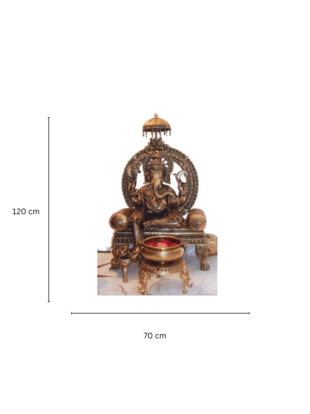 Brass Made Lord Ganesha Statue Sitting on Throne (Without Flower Pot)