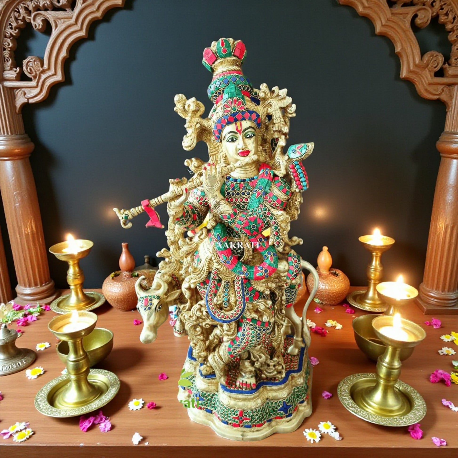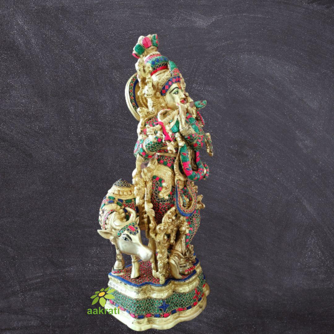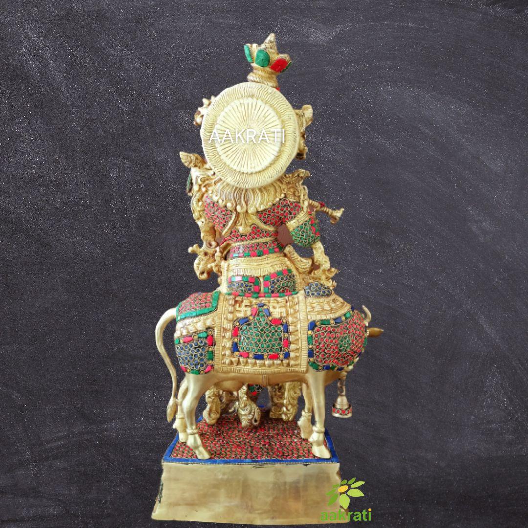 Cow Krishna Statue Brass, Big Brass Lord Krishna Idol with cow, Home Entrance Decor, Wedding Gift