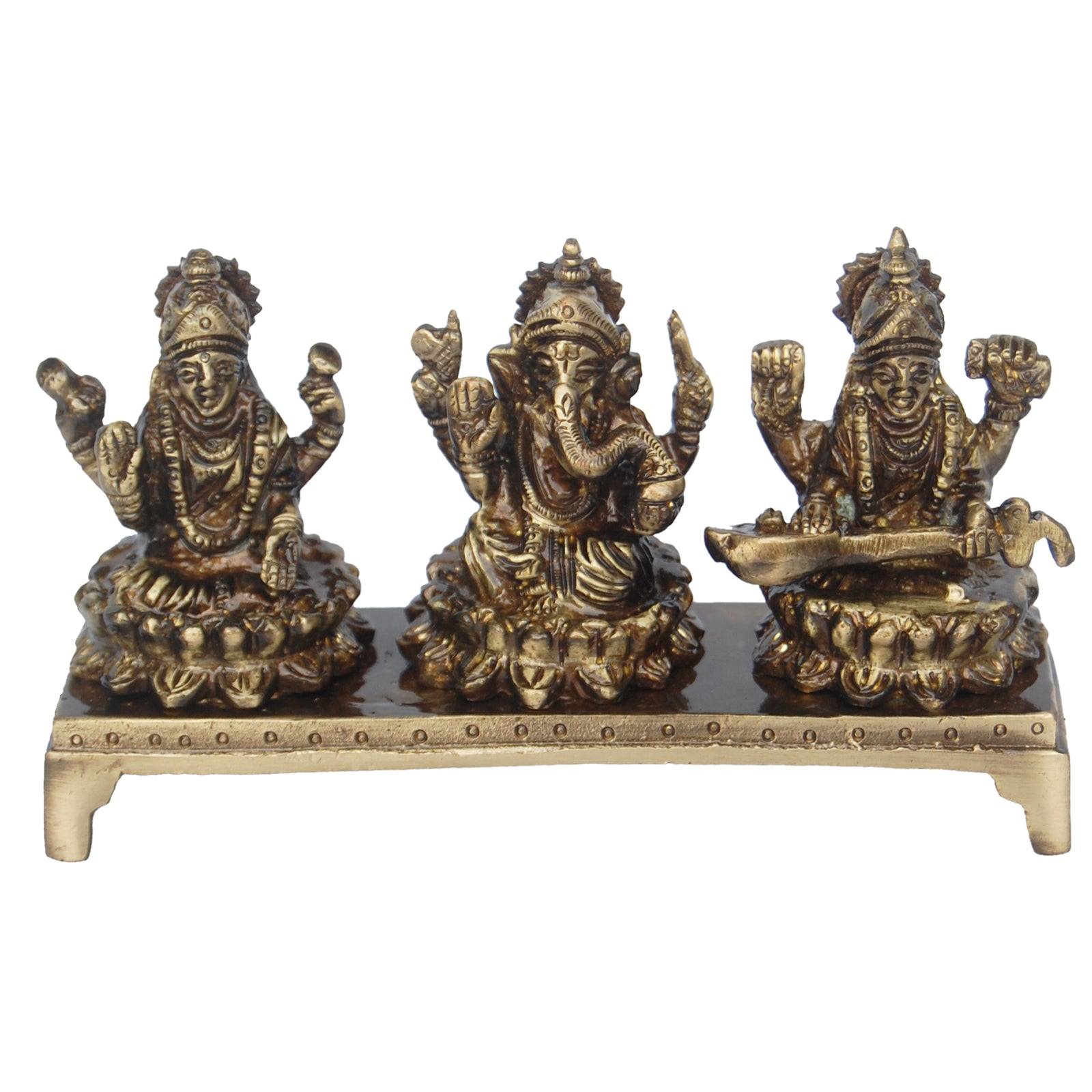 Brass Lakshmi, Ganesha & Saraswati on Chowki | Symbol of Prosperity, Wisdom & Blessings | Brass Religious Idol ( Brown, 5 inch)