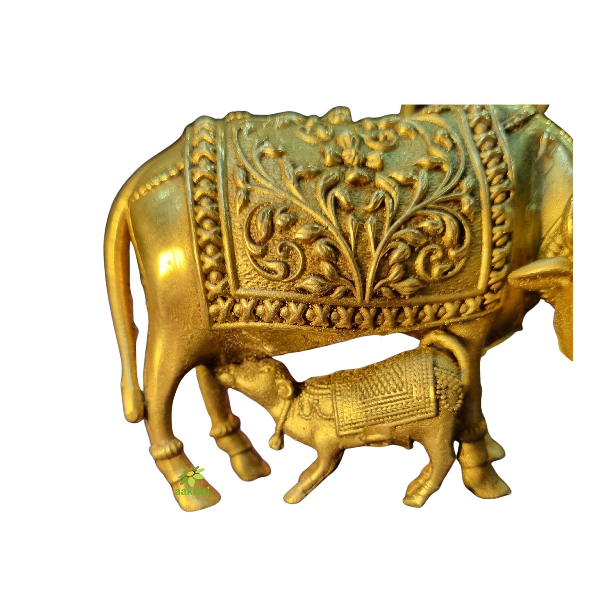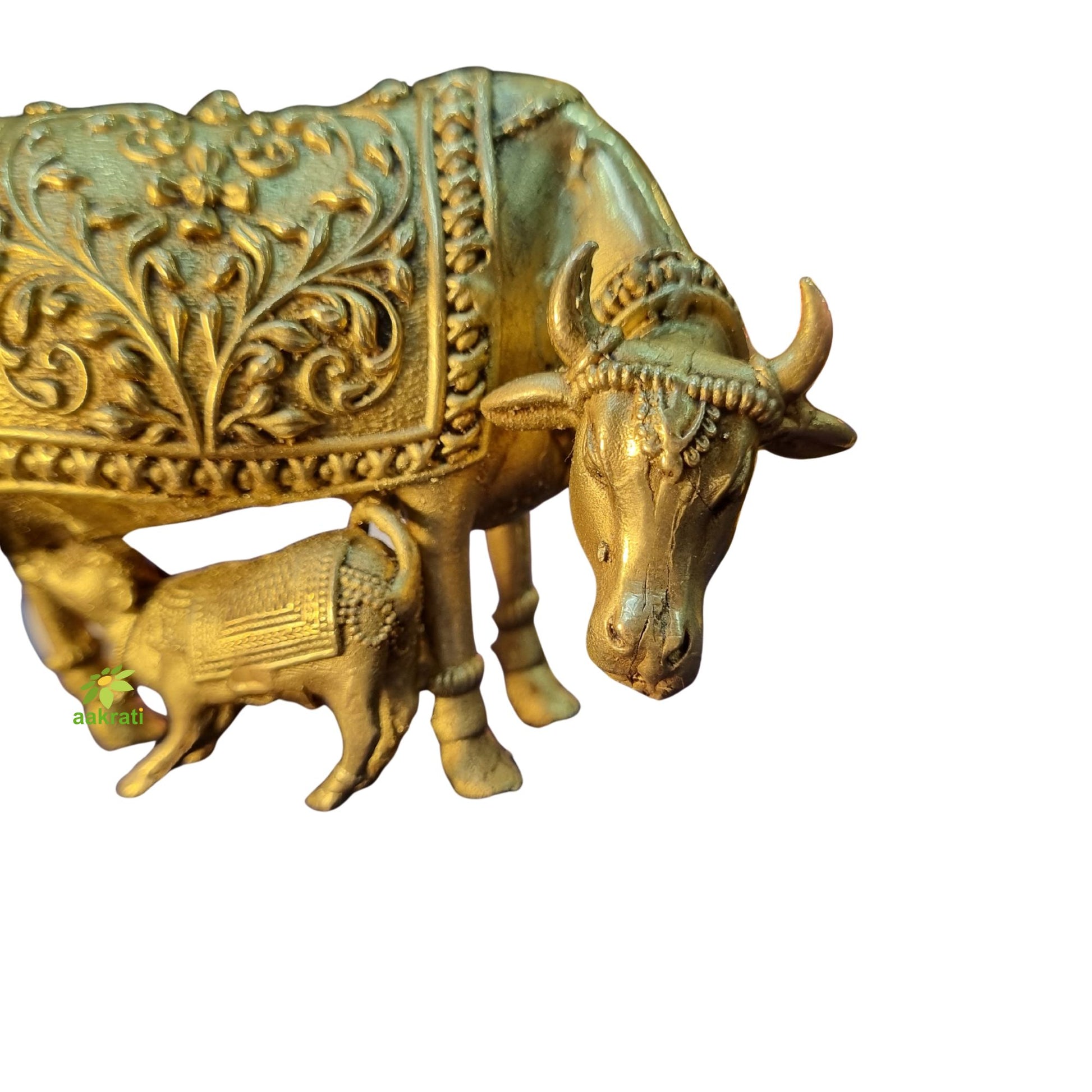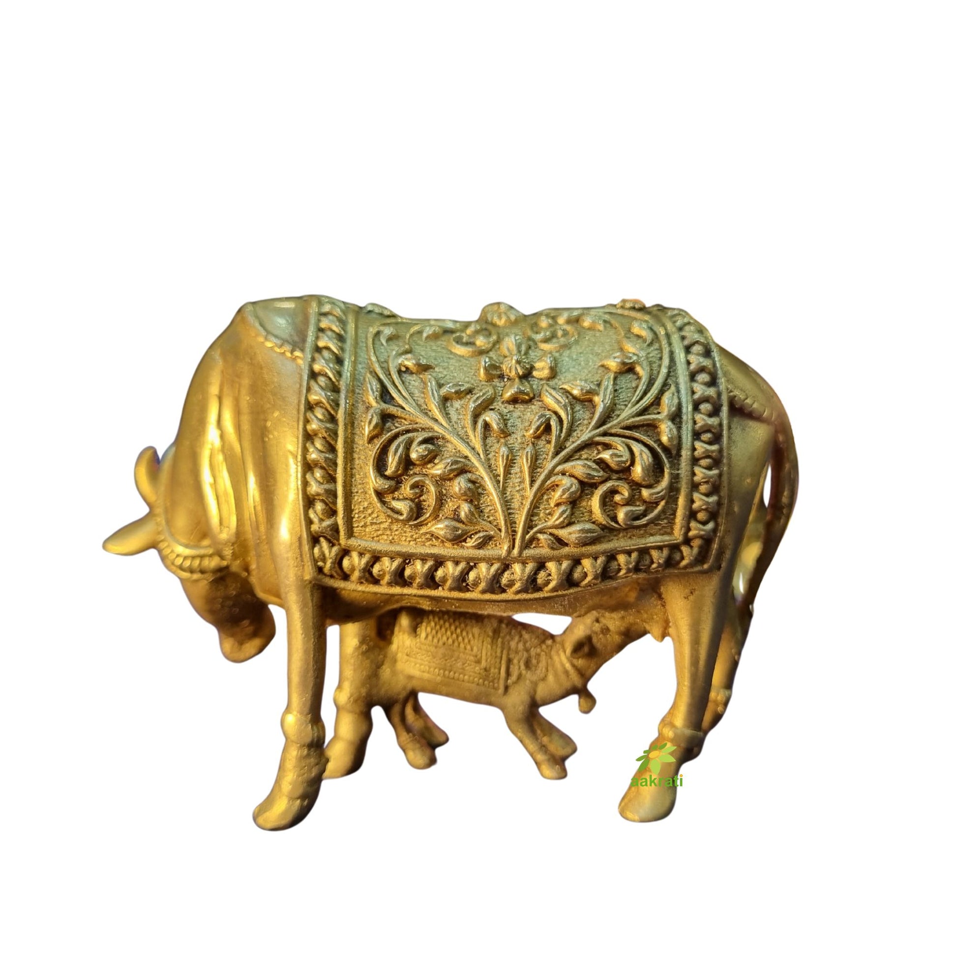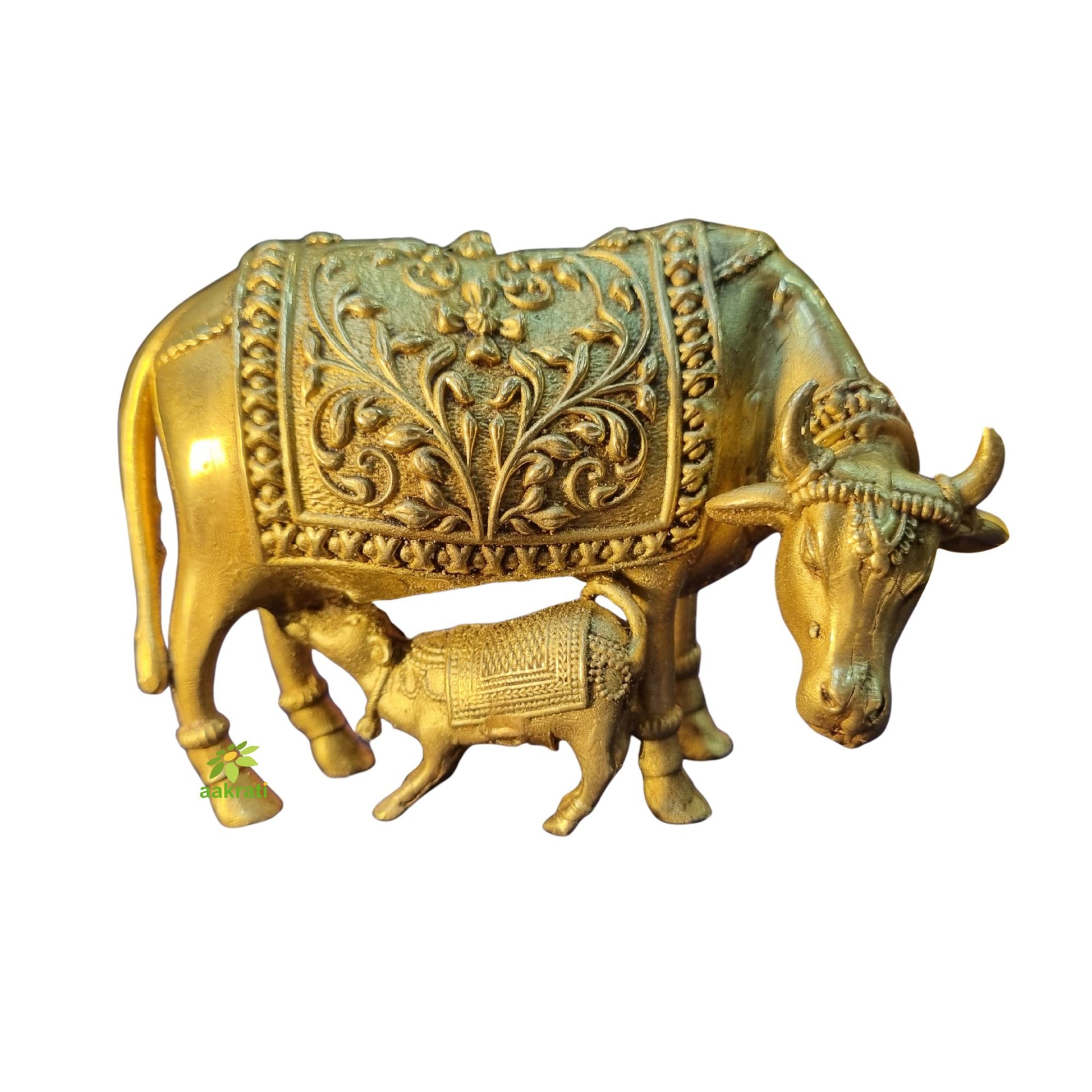Brass Cow and Calf Idol | Kamdhenu Statue for Home Temple & Vastu Decor | Handcrafted Brass Cow with Calf (Yellow, 3 Inch)