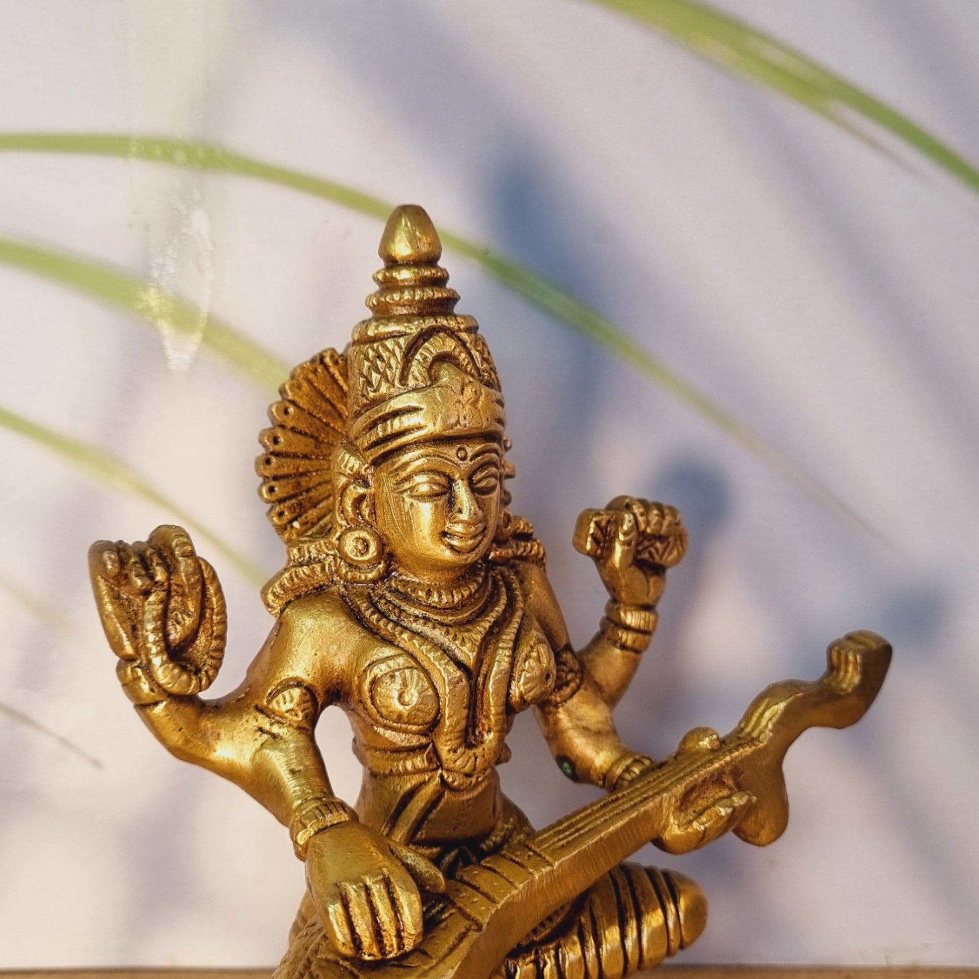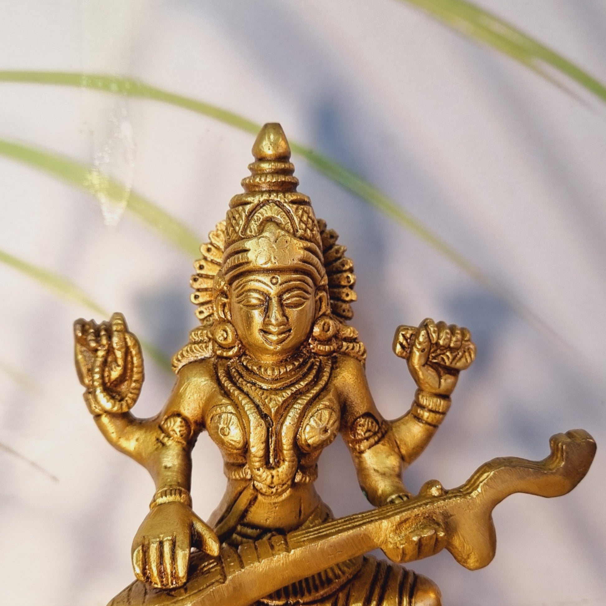 Brass Saraswati Murti | Beautiful Home Decor for Knowledge and Prosperity | Brass Sarawati Figurine ( Yellow, 6 inch)