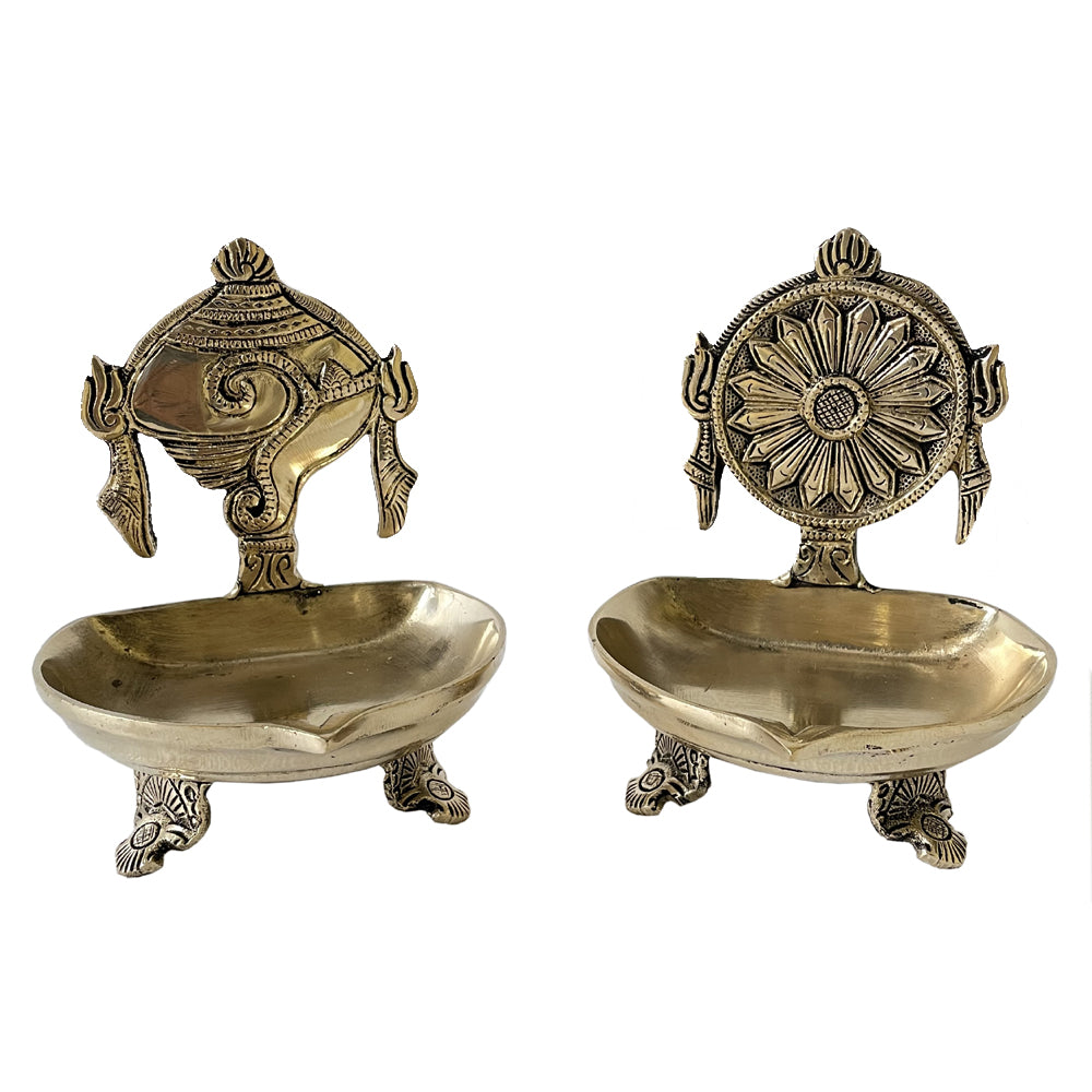 Traditional Brass Shankha Chakra Villaku, Shankh and Chakra Deepam, Diya for Pooja, Aarti, home and Decor (Pack of 2)