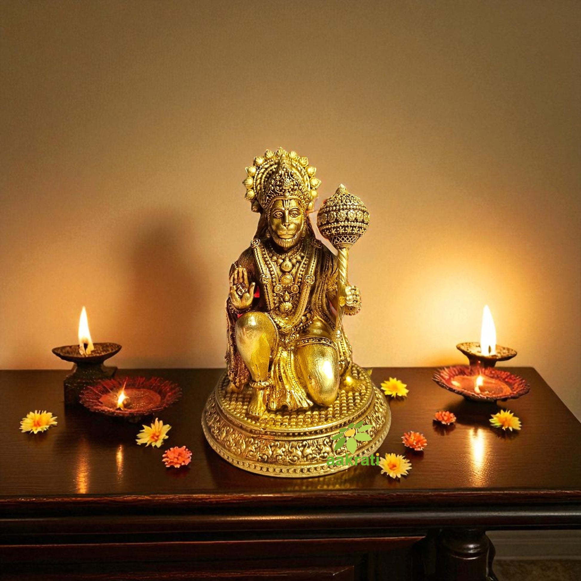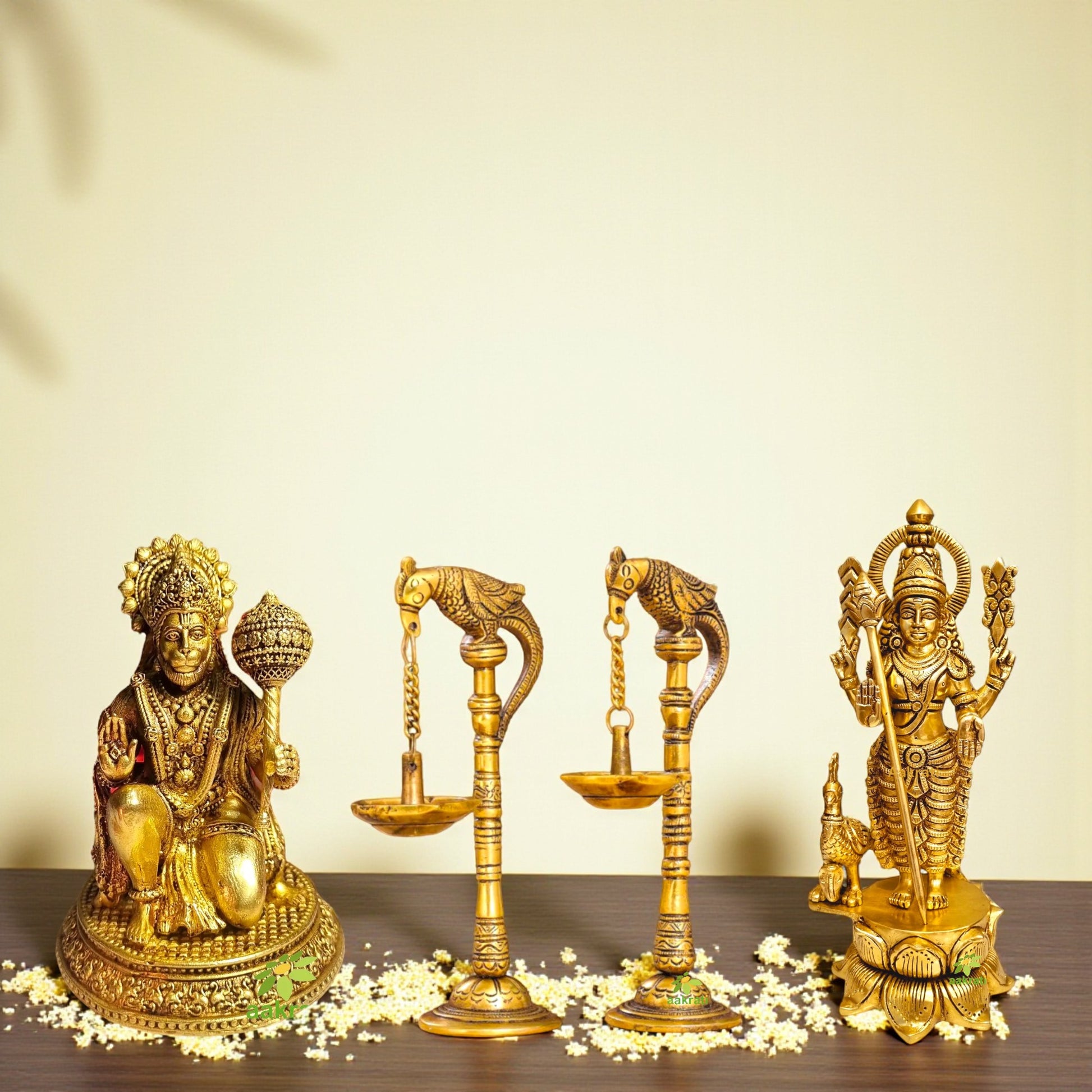 Brass Idol Set – Lord Murugan, Hanuman & Diya Pair | Hindu Religious Gift Combo | Handcrafted Puja Set for Mandir | Ideal for Diwali, Housewarming & Spiritual Decor