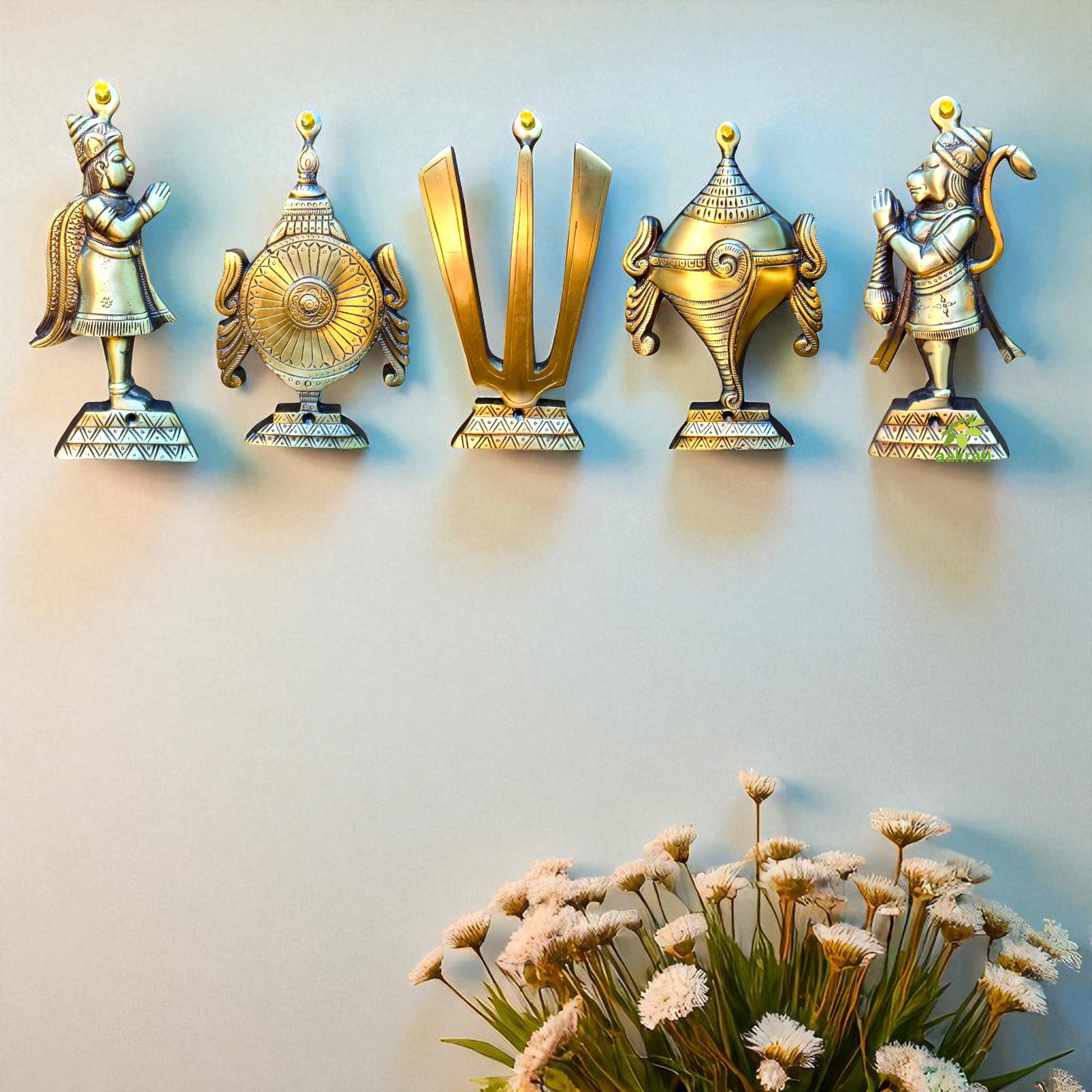"Pure Brass Shankh Chakra Namah Wall Art | "Antique Finish Brass Shankh Chakra Namah wall decor (Yellow 9 inch)