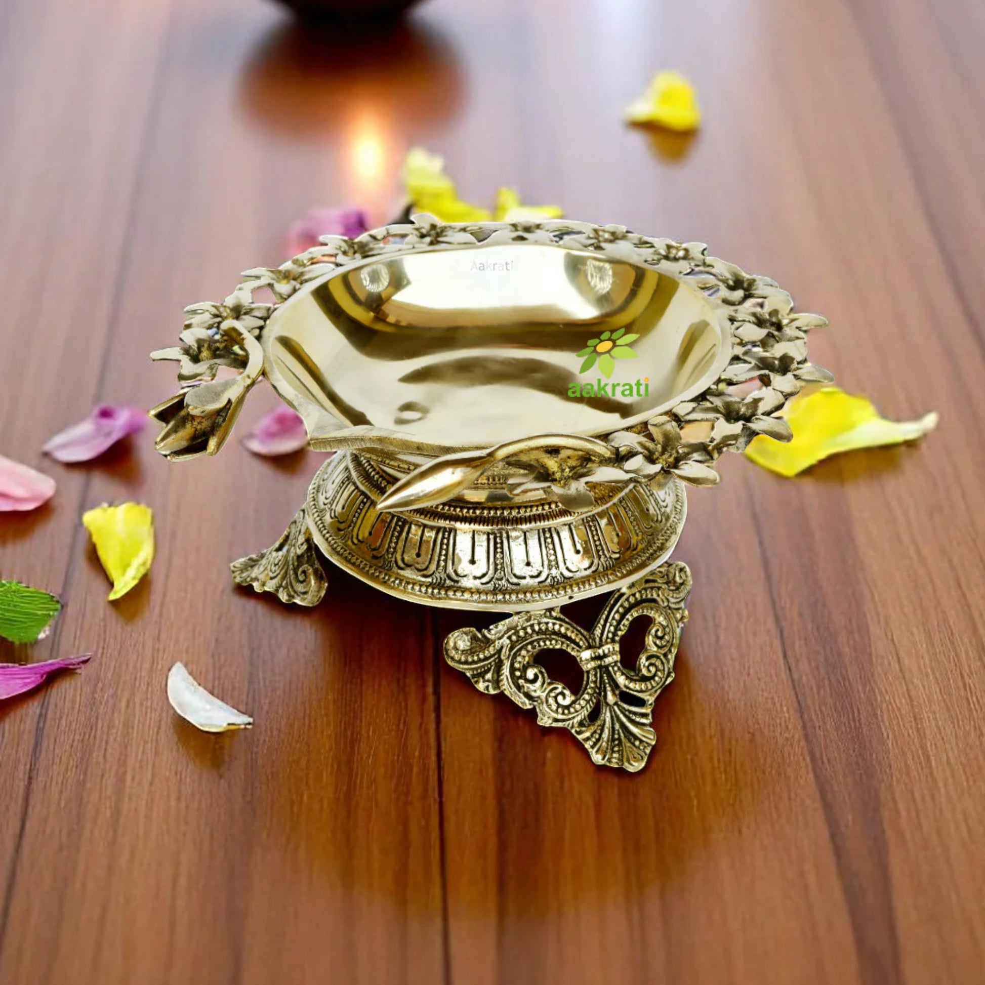 Diya Over Carved Legs, Brass Diya for Temple, Decorative Diyas with decoration flower for Home, Brass Decorative Oil Lamp