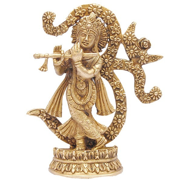 Lord Krishna Statue Playing Flute with Symbol of Om Made of Brass
